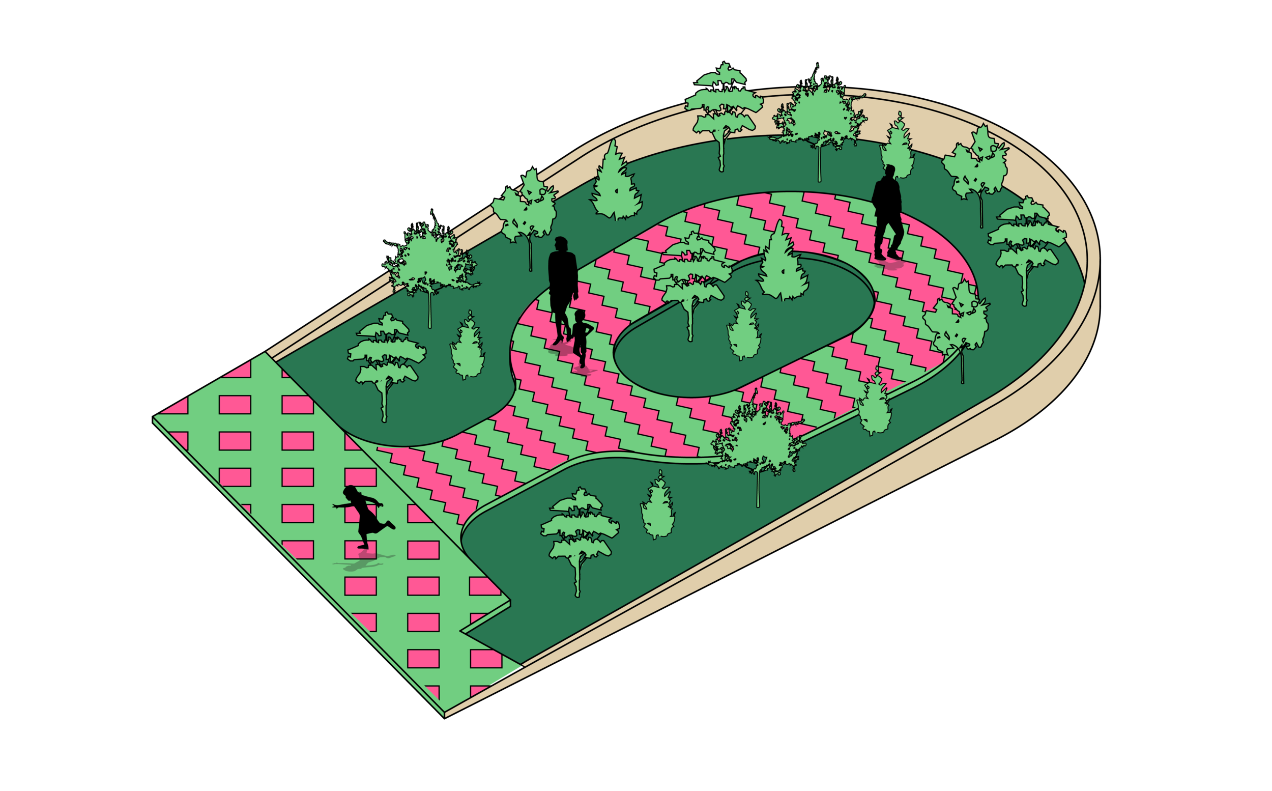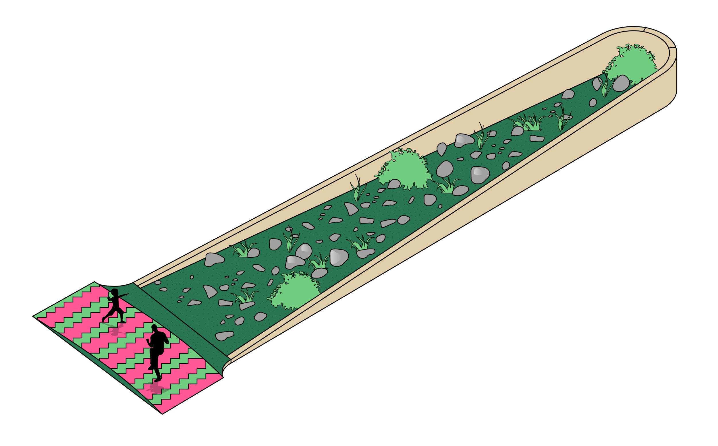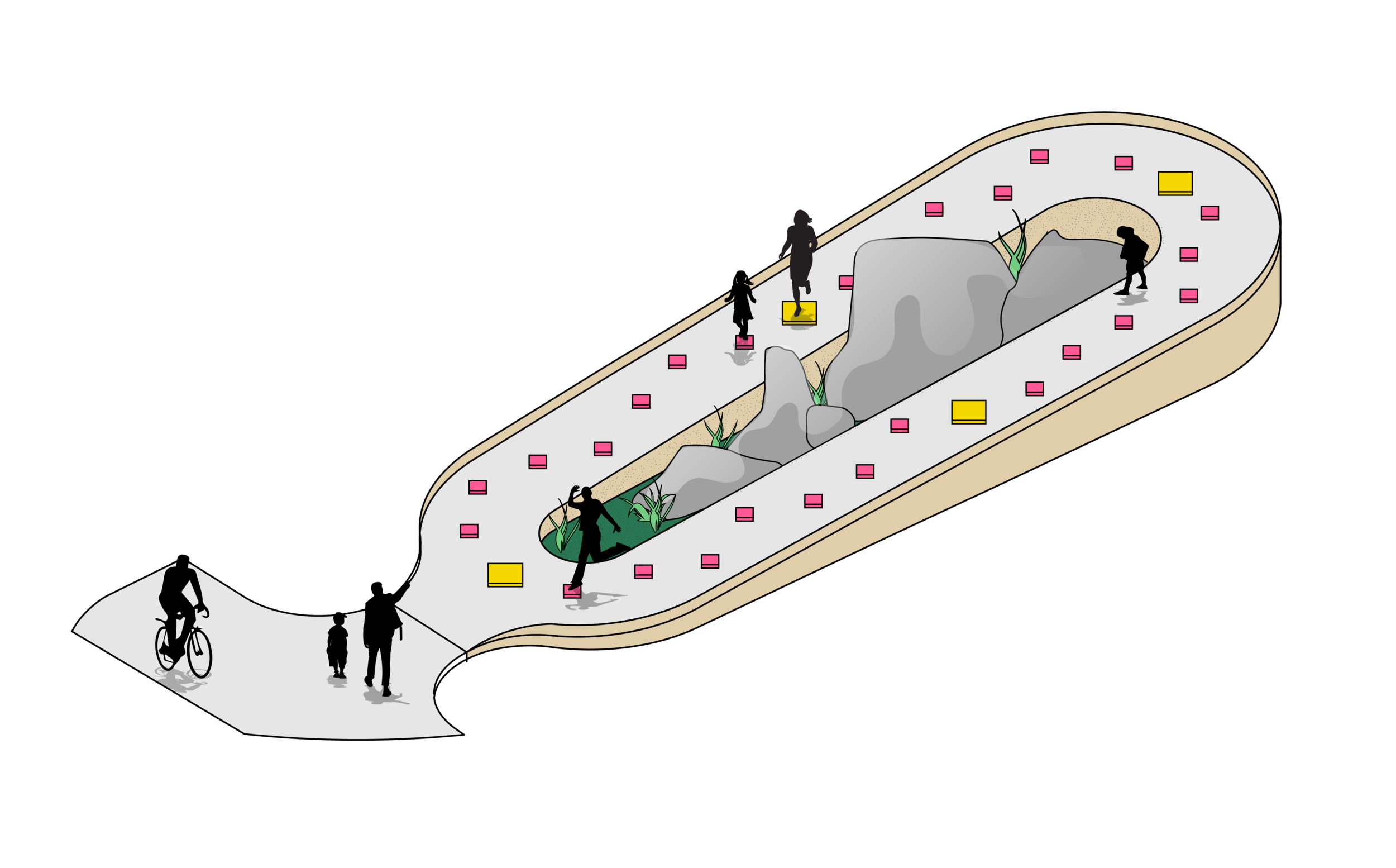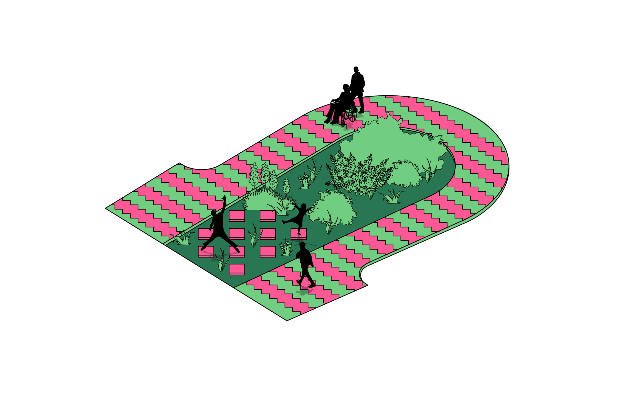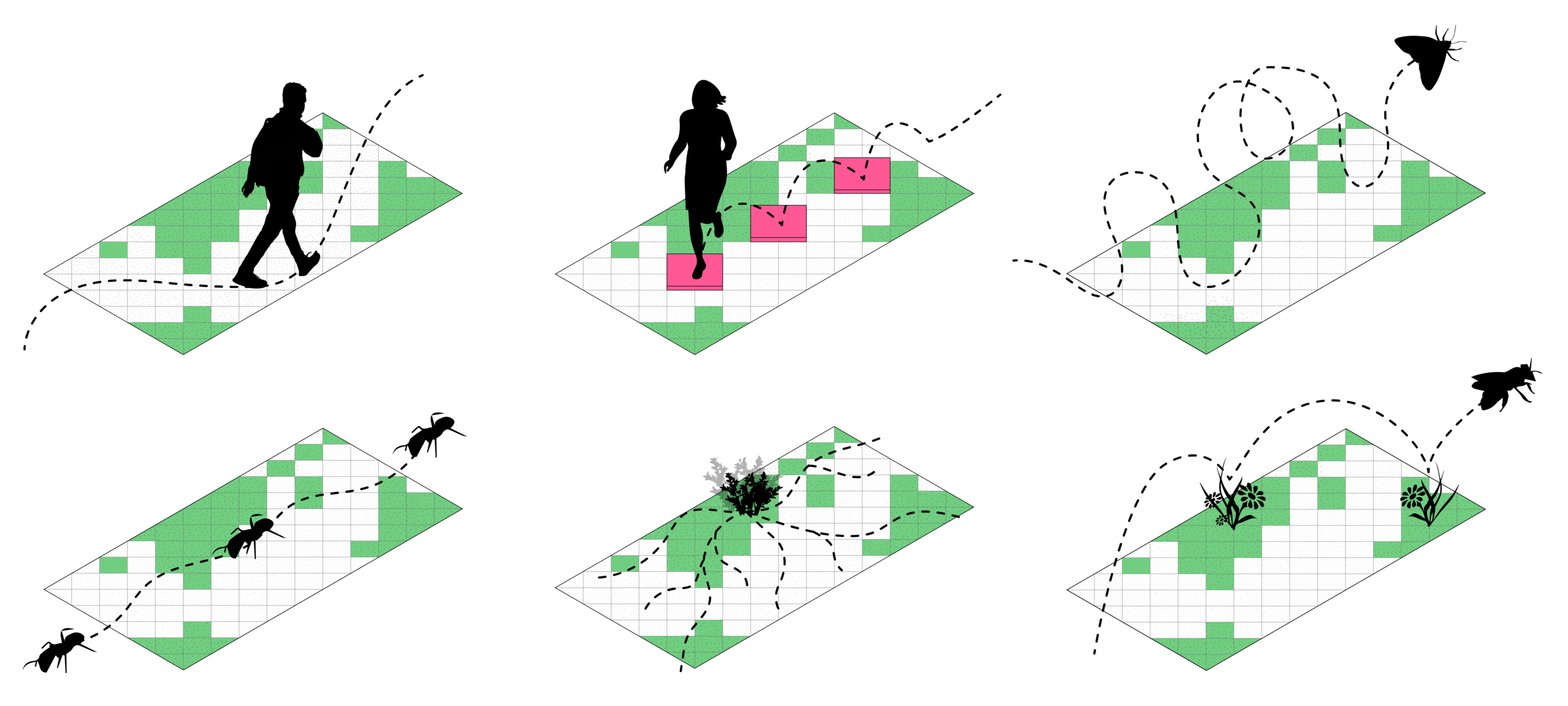 Ce parcours est une série de corridors verts développés pour faire traverser la vie d’un côté à l’autre. Dans l’idée de respecter la façon dont se déplace (bouge, pousse, marche, rampe) chaque espèces, les tuiles au sol sont conçus pour laisser les insects et végétaux se propager (tuile de terre, compost, gravel). Il invite aussi les citoyens à sauter à travers, prendre un détour (tuile pleine) et se déplacer avec les fourmis et les abeilles avec attention.