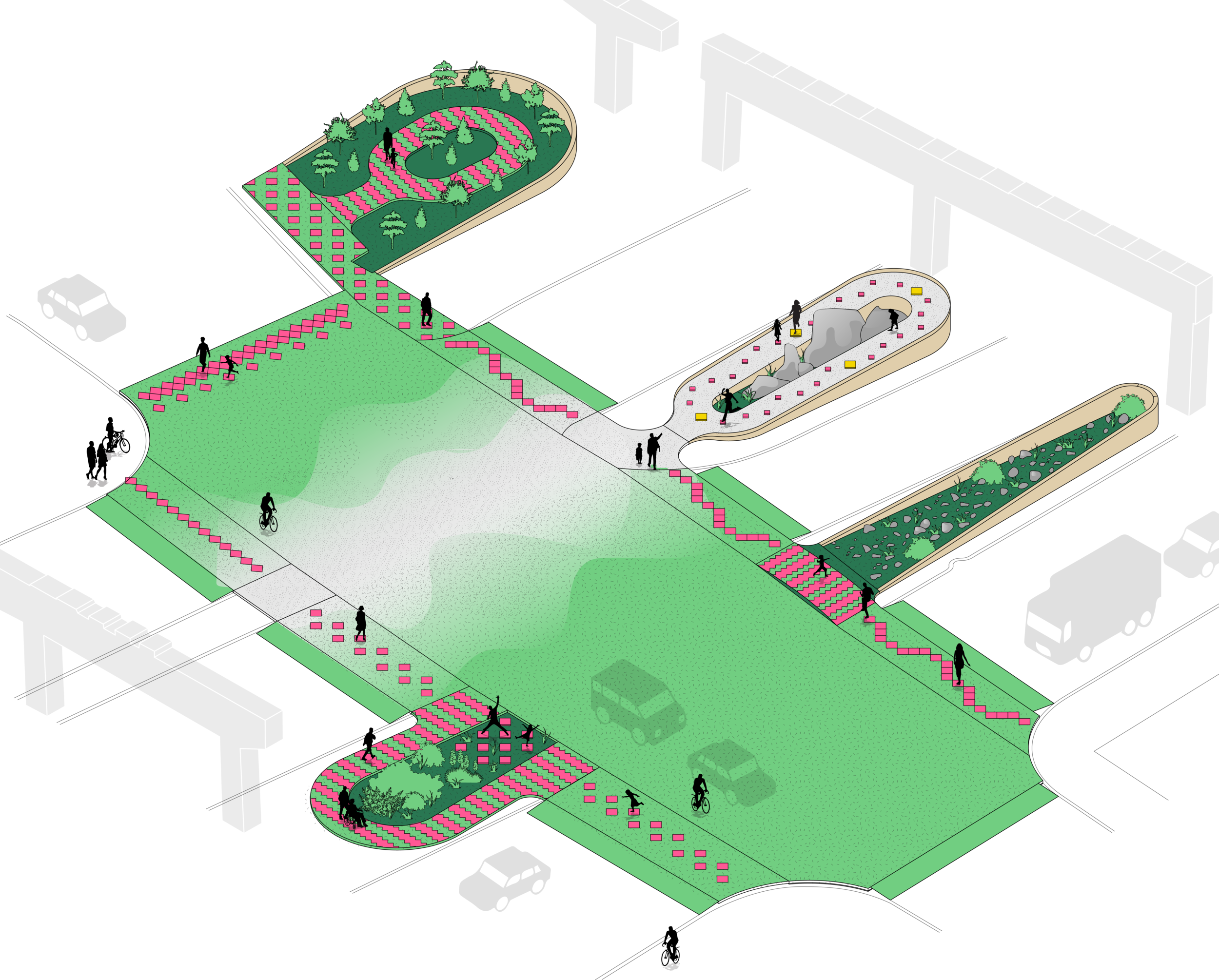 Pour apporter de la vie et du dynamisme à cet endroit des plus improbables, et des nouvelles solutions pour réinventer les écologies urbaines, quatre jardins expérimentaux sont placés de part et d’autre du corridor. Chacun d’eux ont leurs conditions hyperlocales sous l’autoroute (voir schémas).